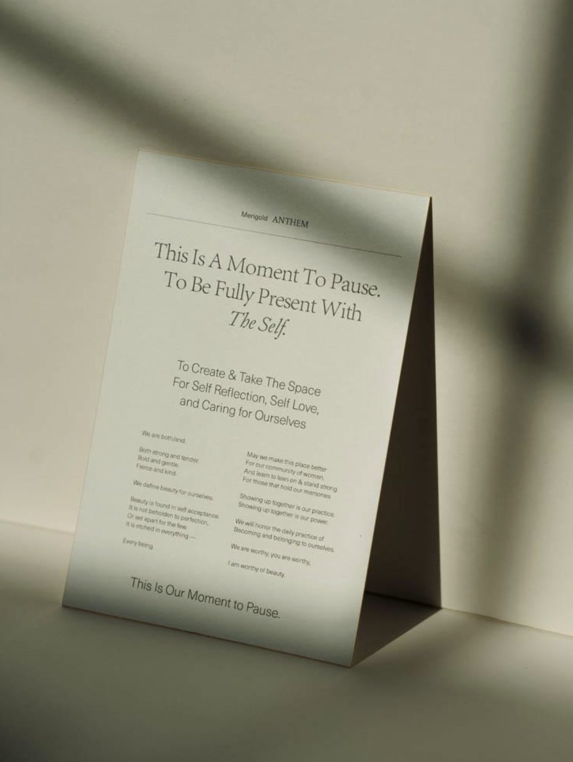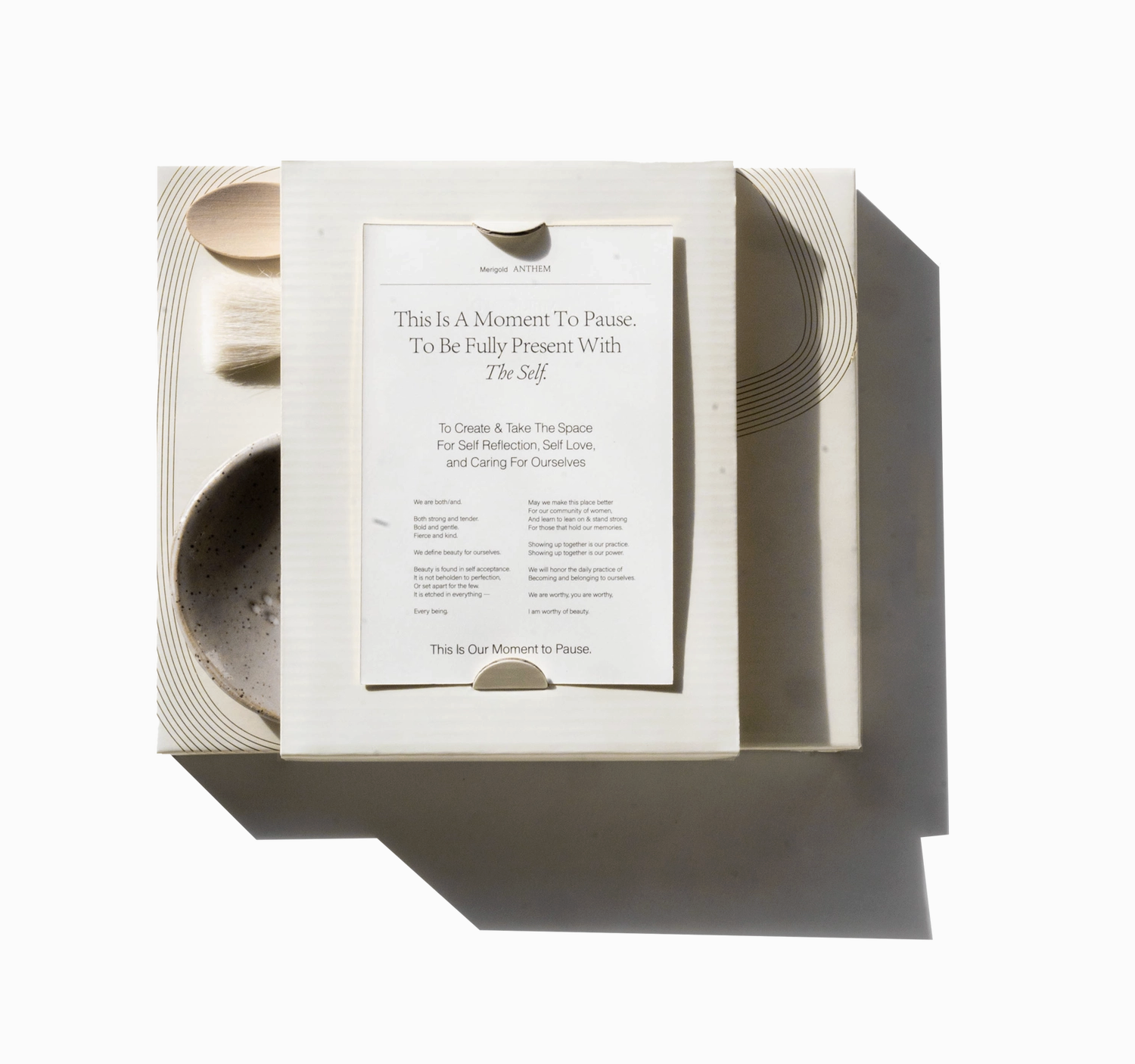 We selected a wooden spoon, which is important to use anytime you are using clay in a mask (which some of our masks have as an ingredient). You always want to avoid using metal with clay. What is the Merigold Anthem? It is the heart behind Merigold. Intended to be read at the beginning of your facial mask ritual. Helping you set your intention for your moment of pause.