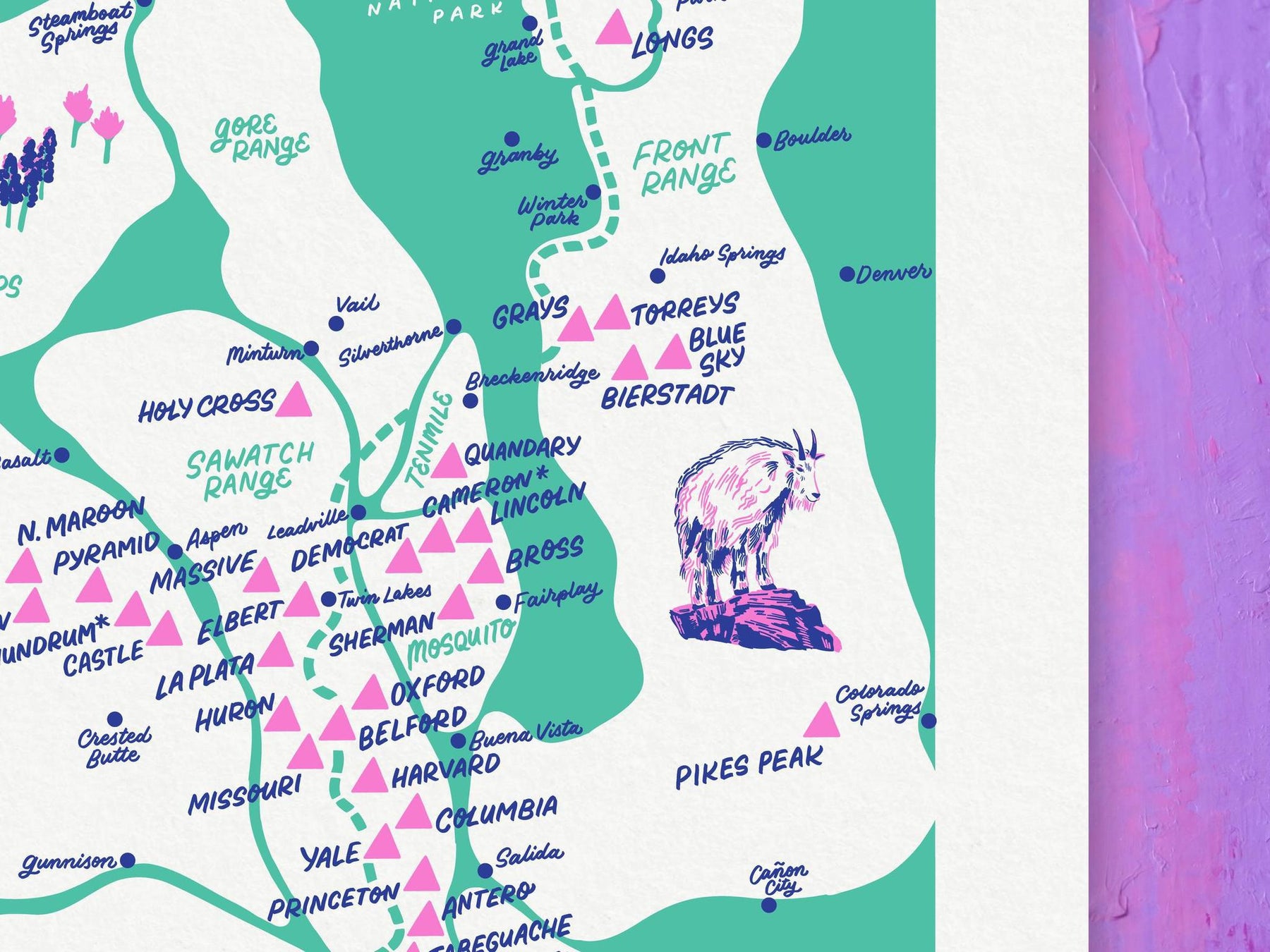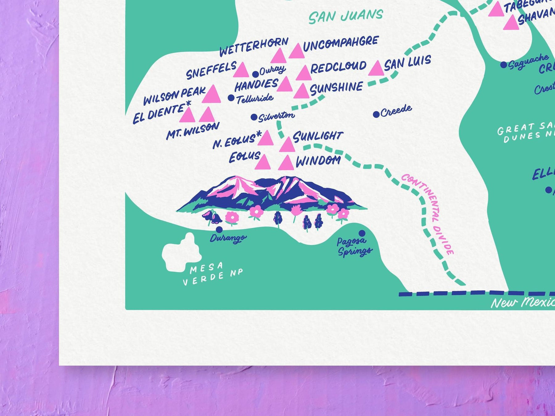 Whether you’ve bagged all 58 peaks, aim to summit them, or are simply admiring them from a safe distance, this print celebrates Colorado’s dedication to elevation.