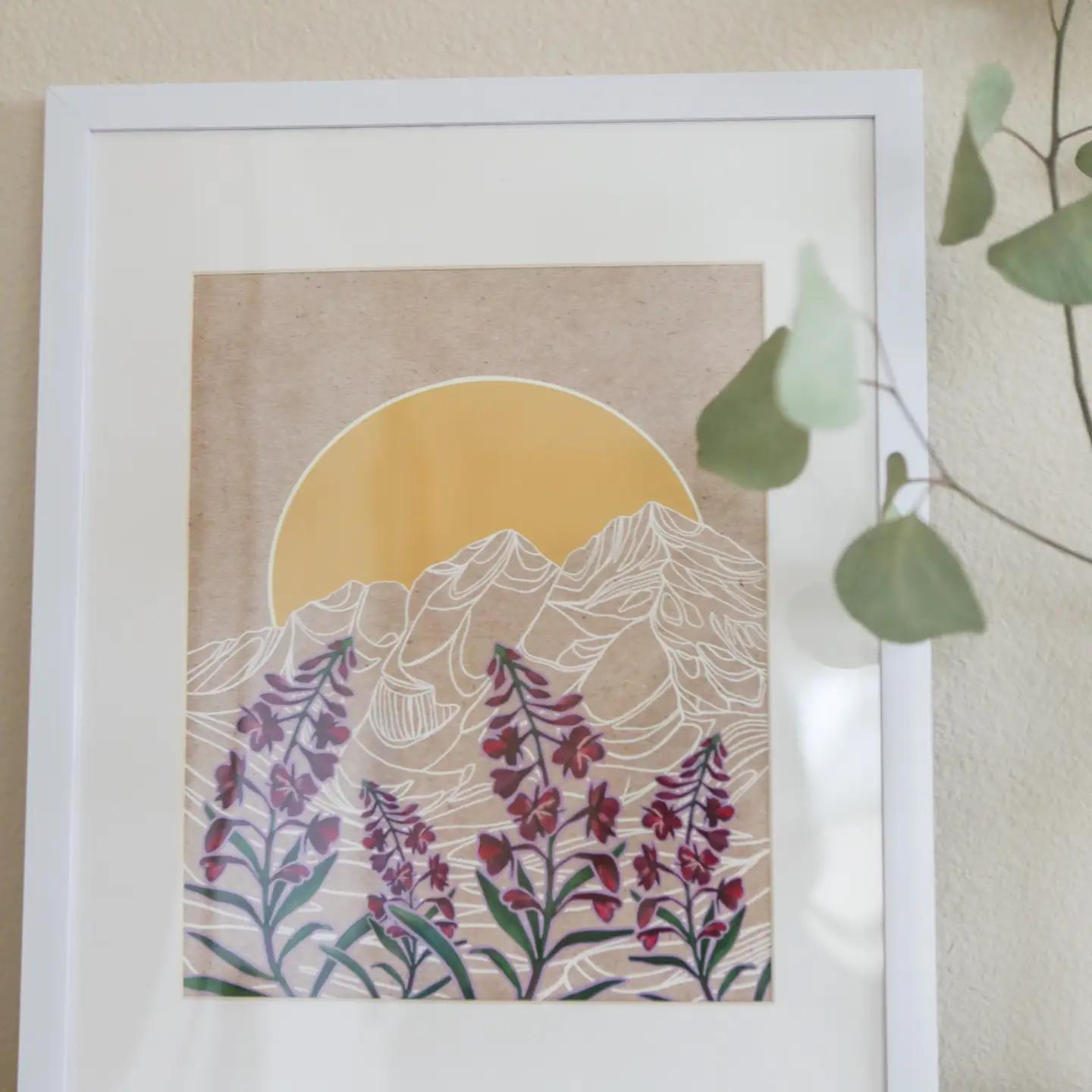 Based off the iconic Maroon Bells, this is a digital collage featuring a line drawing and acrylic fireweed flowers. This is a borderless giclée reproduction, printed on hot press bright archival paper.