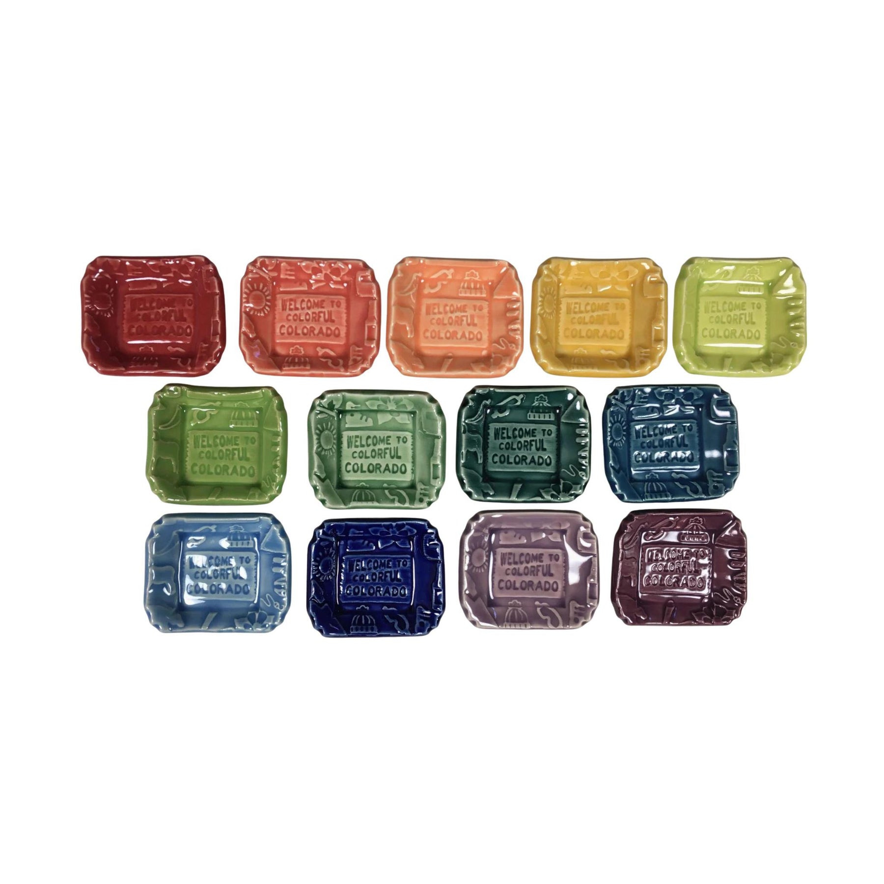 10 Welcome to Colorful Colorado little dishes. * Size: about 2 1/4" rectangle * Color: assorted * Design: Welcome to Colorful Colorado * Leadfree * Oven Microwave and Dishwasher safe My process: I love to hand build pottery. My pottery is made from stoneware clay and fired in a kiln to over 2000 degrees. I use a slab roller to flatten the clay then cut out the shapes. I then press the design into the clay and let it harden. After is is dry, I fire it in the kiln the first time. Then it is called "bisque". It is now ready to glaze and fire the second time. The result is the beautiful pottery you see here. Due to the handmade nature of pottery, each one will be a little different. Please allow for slight artistic variations. These differences are to be expected and cherished.