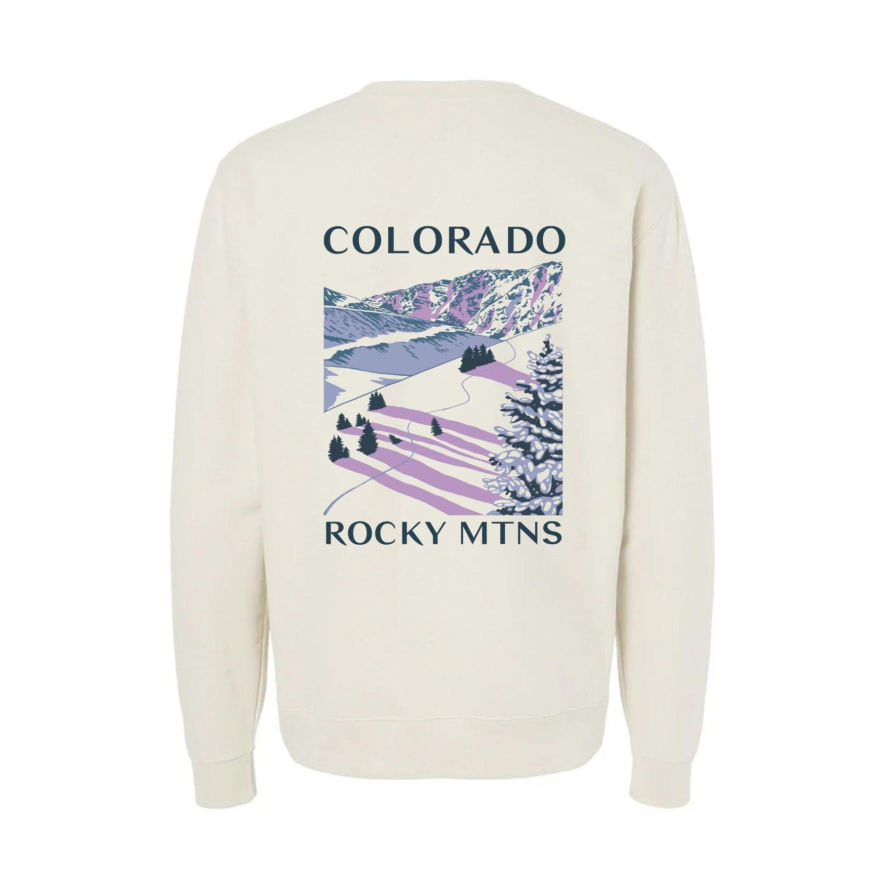 Meet the crewneck that’s quickly become a shop favorite. The Alpenglow design by Colorado artist Melody Ward captures that magical moment when the mountains glow with soft pink and gold light—an ode to the most peaceful part of any alpine day.