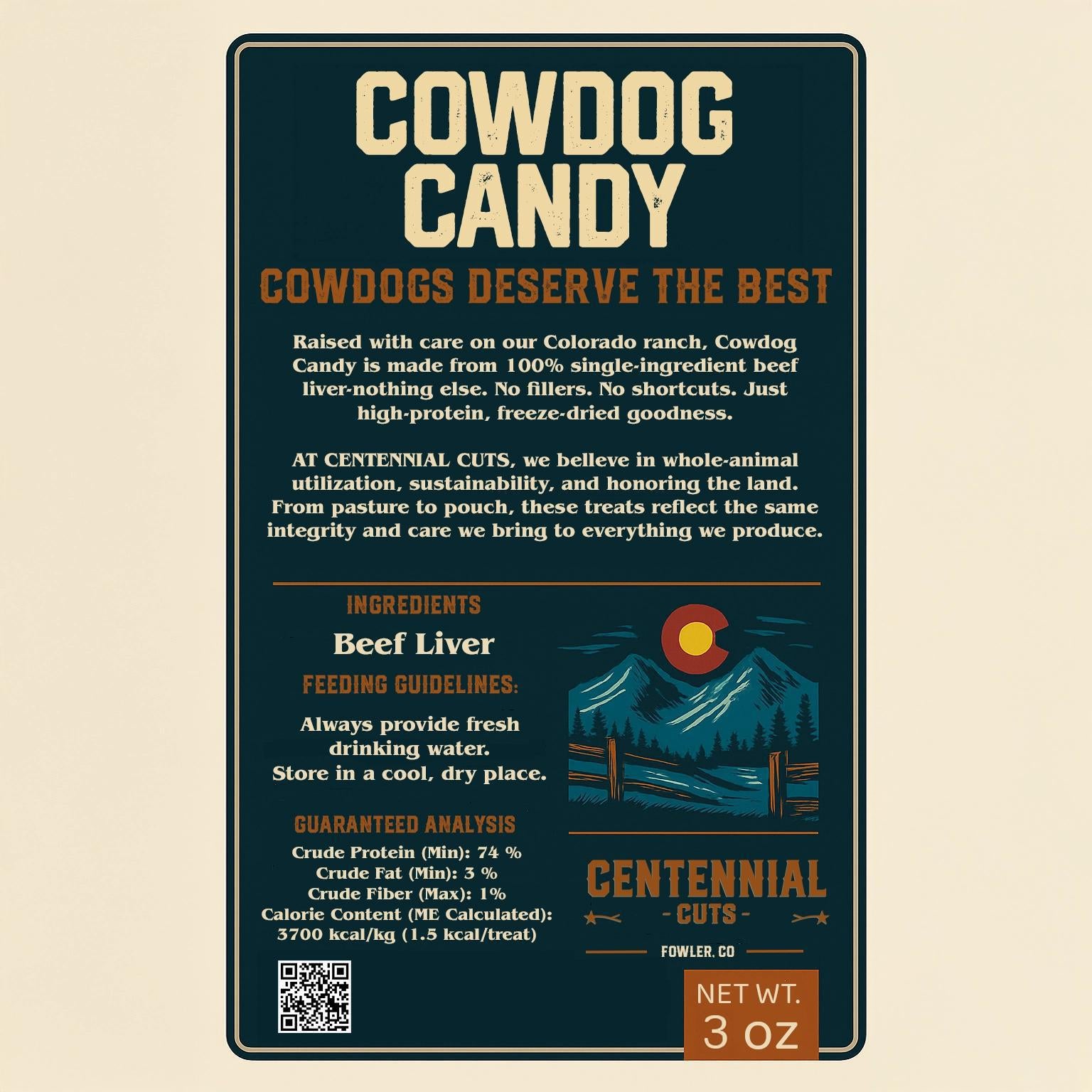 Single-source protein, naturally dehydrated Colorado beef. A nutrient-dense source of natural vitamins and minerals. Raised with care on our Colorado ranch, Cowdog Candy is made from 100% single ingredient beef liver-nothing else.