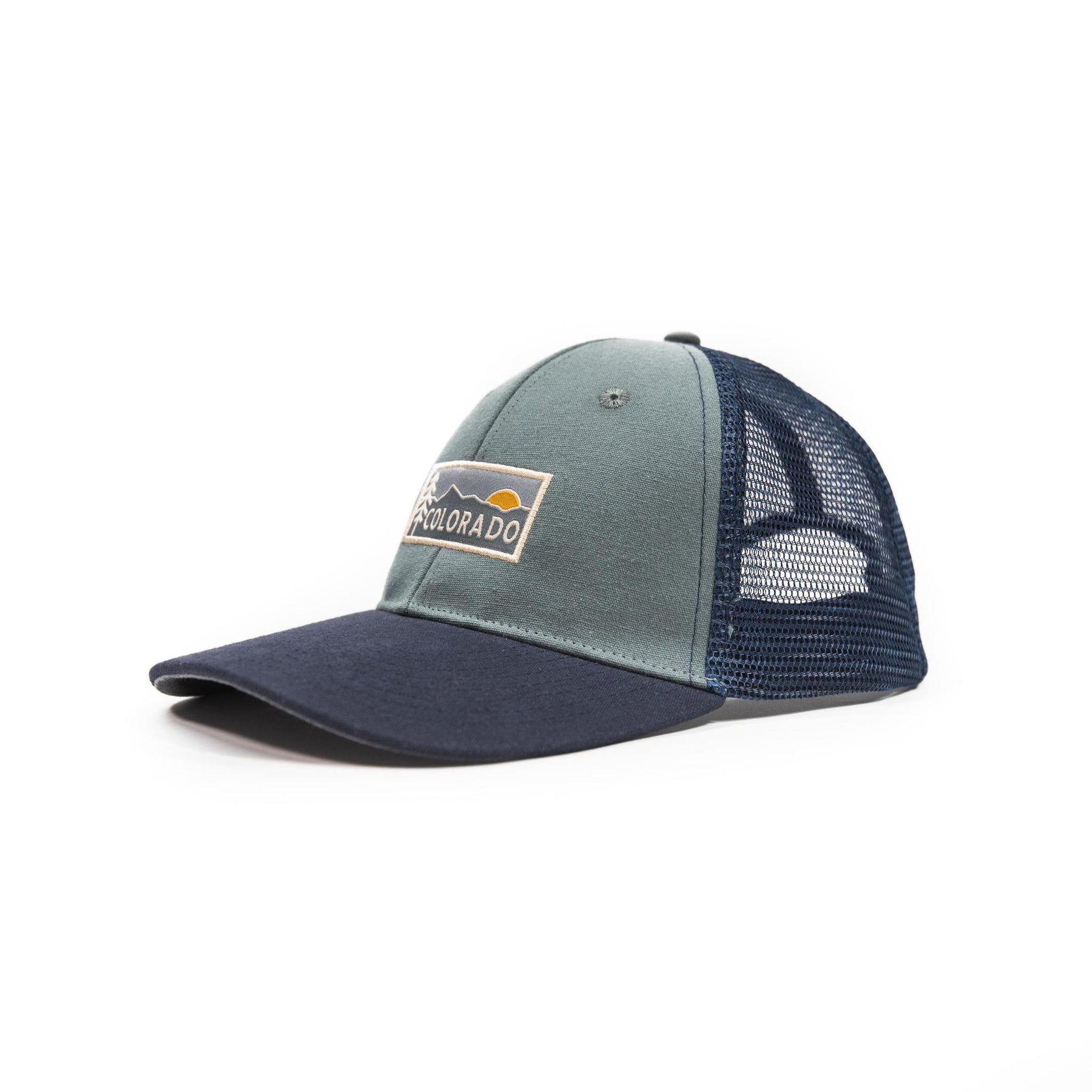 Fit: Classic, Mid Pro Mesh Back Trucker with a slightly curved brim Color: Grey Blue Crown, Button Top & Bill Underside, Navy Blue Bill, Mesh Backing & Band Front: 2.5-Inch Woven Patch – Light Grey, Light Grey Blue, Grey Blue, Mustard Yellow Back: Navy Blue Snapback Closure