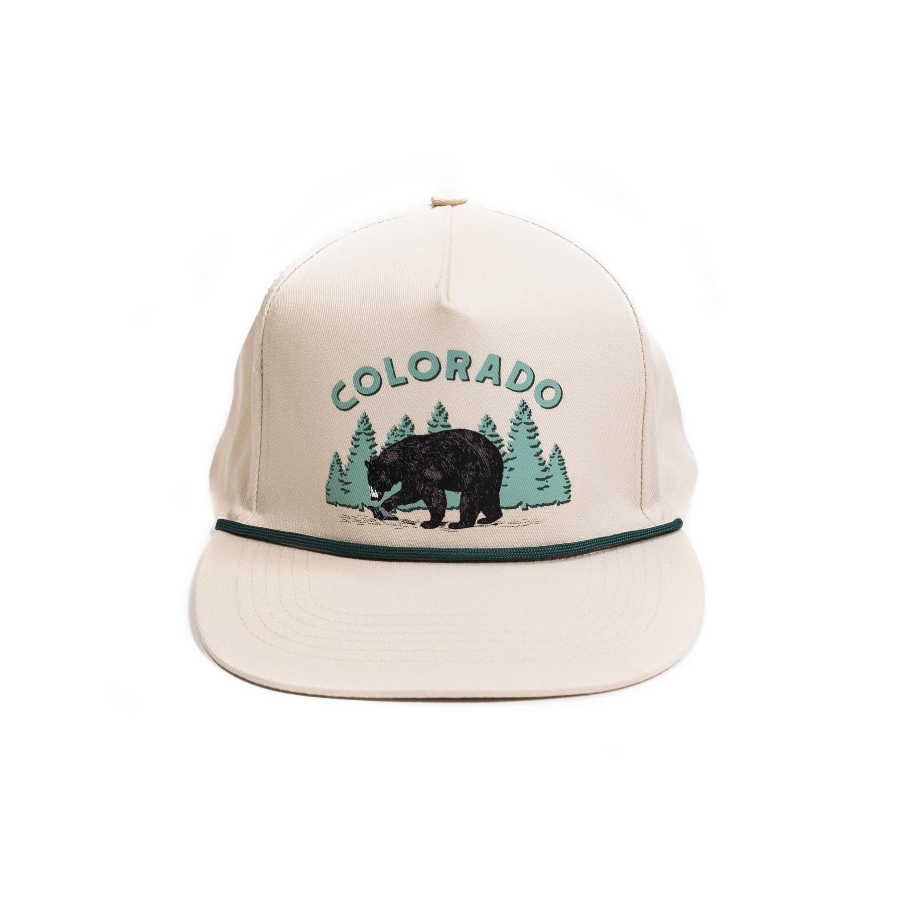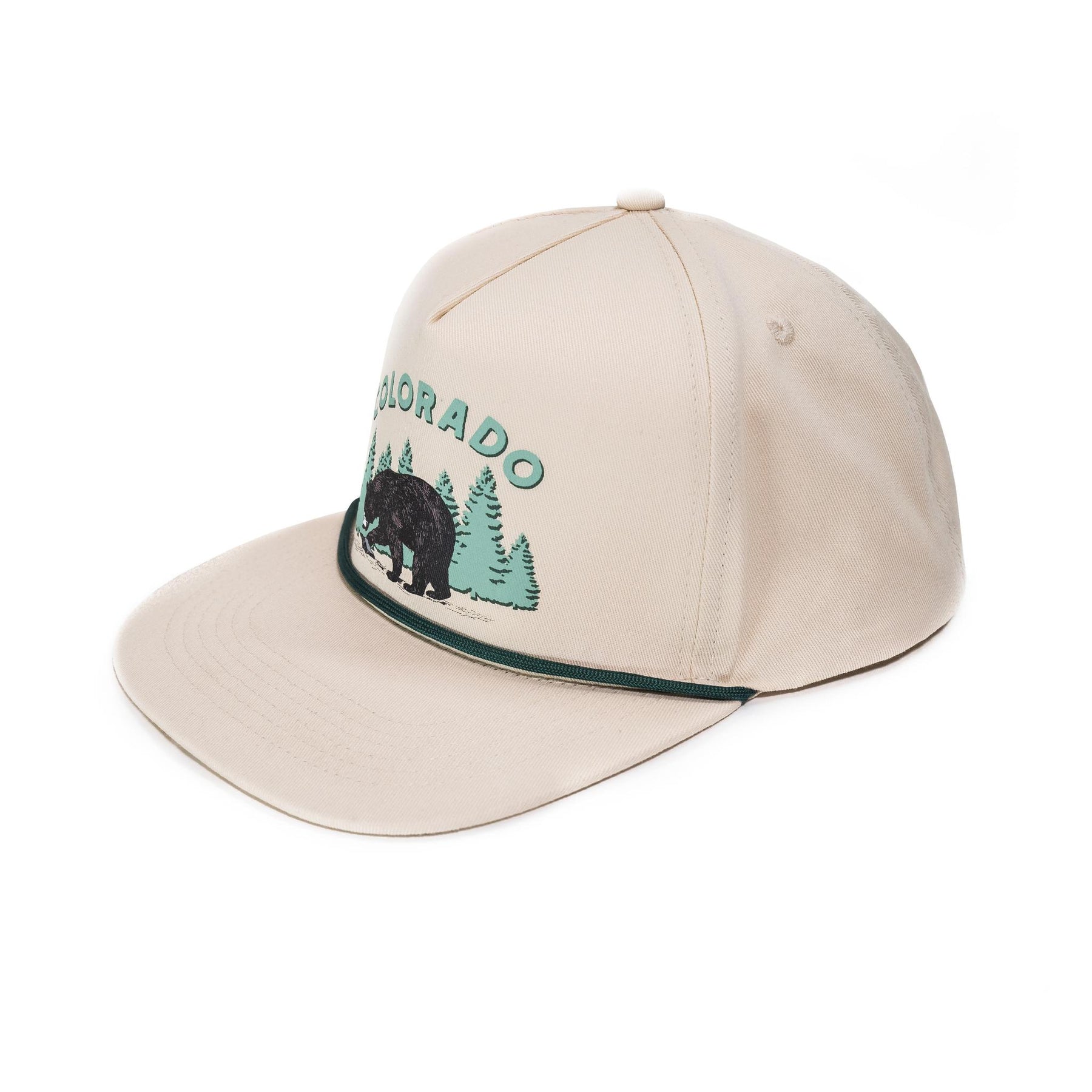 Meaning “Let’s go!” This hat is named after the Australian slang word perfect for the person who always wakes up early and has to tell their mates to crack on if they want to make first chair. The Full Fabric Trucker runs large but has an adjustable back strap, so this hat truly will fit every head. It has a retro feel with a printed bear and pine tree graphic under “Colorado” text, and dark green braided rope. Best worn when driving to the mountain.