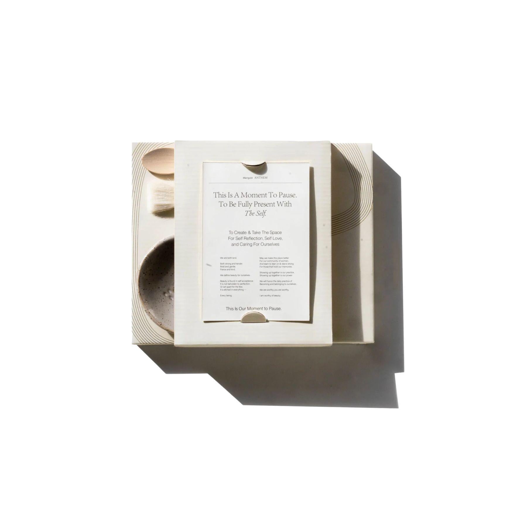Includes: * Handmade, Locally Crafted Ceramic Bowl * Goat-Hair Mask Application Brush * Wooden Spoon for Mixing Your Mask * Anthem Card Merigold is honored to be working with Andi from Good Hearted Woman. She has handcrafted each ritual bowl in her studio in Denver, CO.